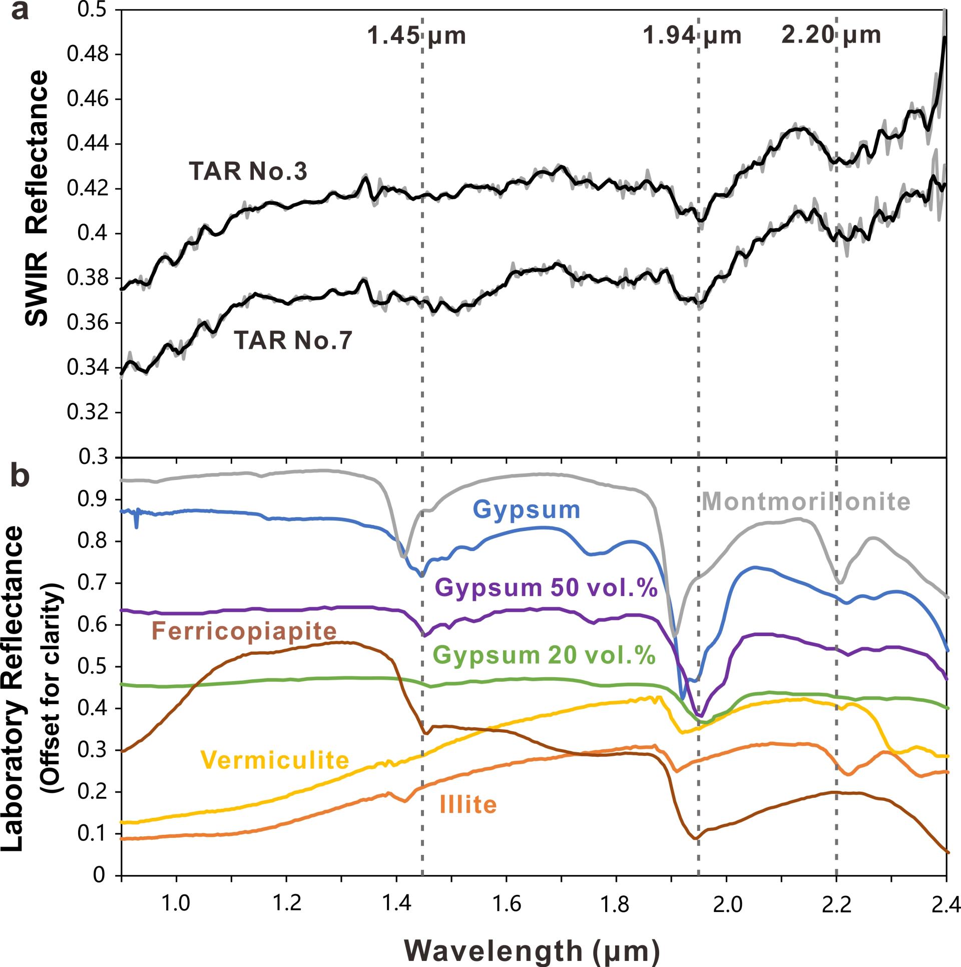 该团队也利用“祝融号”导航与地形相机数据,对火星车巡视路线上的TARs表面形貌特征进行了详细刻画,首次在火星TARs表面识别出小型多边形裂隙(图2)。同时,对原位光谱数据的解译表明,这些裂隙分布区的表面可能存在石膏等含水硫酸盐矿物(图3)。