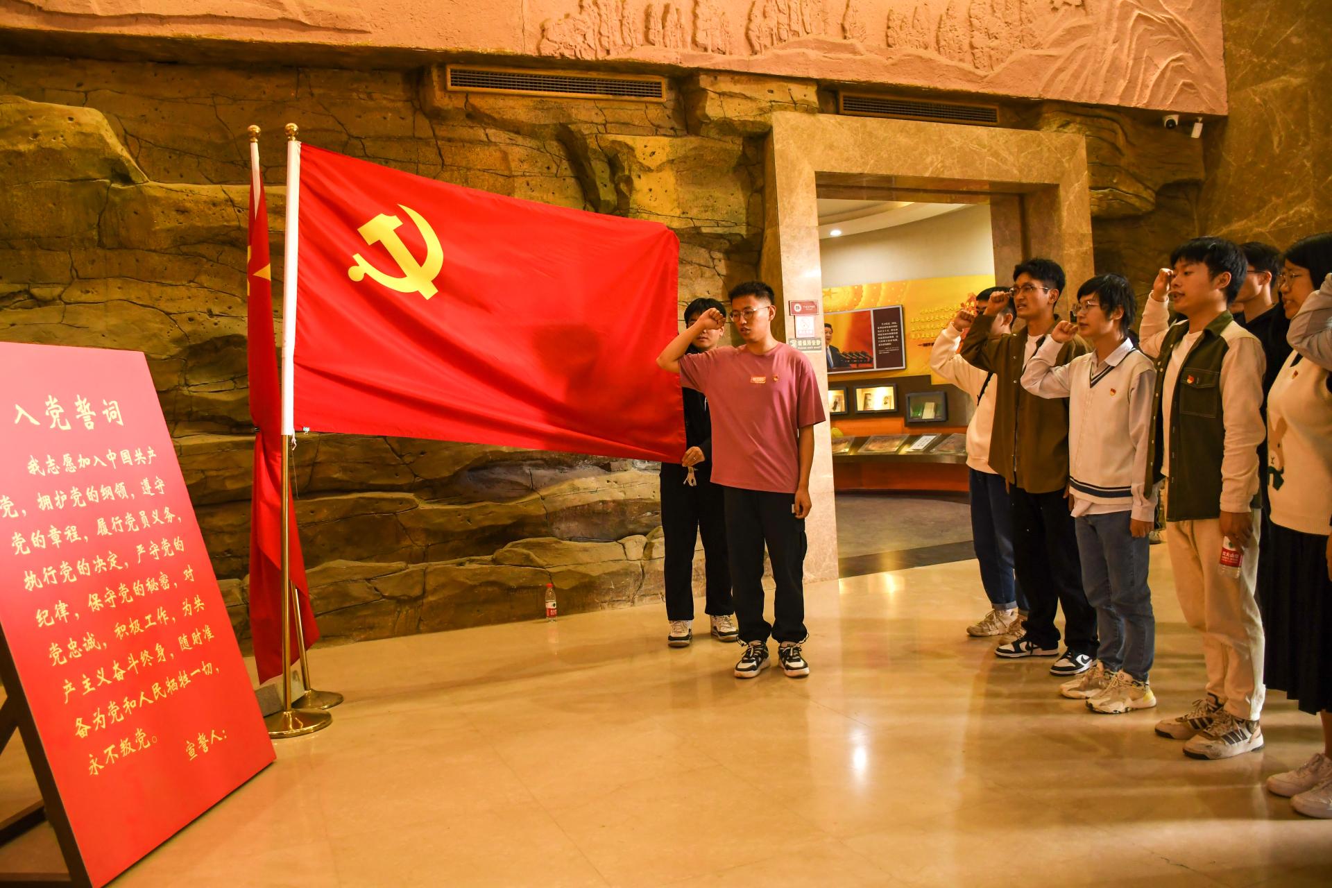 4月30日下午,师生党员们离开金岭村,来到宣化店中原突围纪念馆。1946年6月26日,震惊中外的“中原突围”战争就是从这里打响,拉开了全国解放战争的序幕。进入中原突围历史纪念馆,学生党员栗千贺带领全体党员在党旗下重温入党誓词。