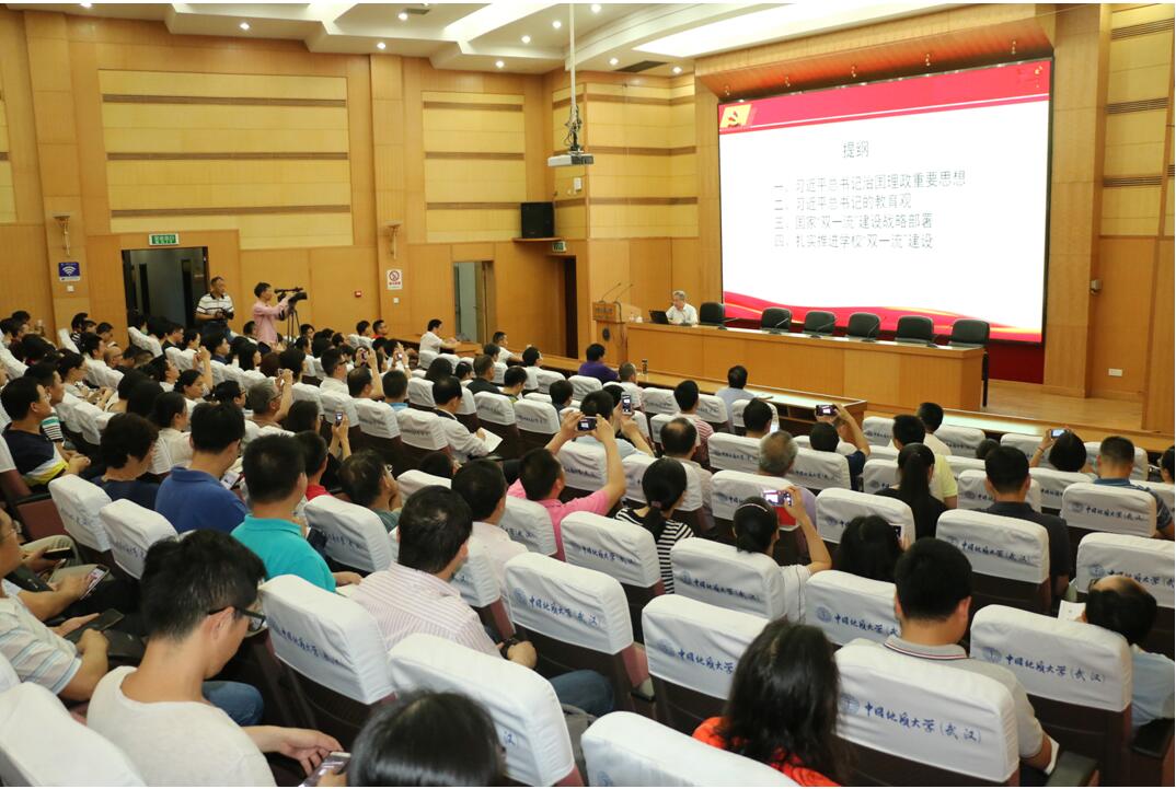 2017年6月20日晚七点,在迎宾楼报告厅,地学院党委组织学院教工党员开展6月份主题党日学习活动,邀请王焰新校长以《深入学习习近平同志治国理政重要思想扎实推进学校“双一流”建设》为题为全院教工党员讲党课。学院党委书记王甫同志主持本次党课。 王焰新从习近平总书记治国理政重要思想、习近平总书记的教育观、国家“双一流”建设战略部署和扎实推进学校“双一流”建设四个方面讲授本次党课。 王焰新以坚持和发展中国特色社会主义为主线,从一个“中国梦”、“两个一百年”奋斗目标、三个层面的社会主义核心价值观、“四个全面”战略布局、“五位一体”和五大发展理念等方面,对习近平同志治国理政重要思想进行了高度概括性的凝练并做了详细阐述。 王焰新系统的梳理了习近平总书记的教育观。他强调“立德树人”是高等教育的根本任务,要求教育事业不仅要传授知识、培养能力,更要把培养和弘扬社会主义核心价值观落实到推进教育治理体系和治理能力现代化中去,引导学生树立正确的世界观、人生观、价值观。 王焰新对国家战略部署《统筹推进世界一流大学和一流学科建设总体方案》进行了解读。他回顾了“双一流”政策出台的背景,分析了“双一流”政策的主要内容与特点,结合学校在“双一流”创建过程中的实践与研究,他强调广大老师要加强对一流大学和一流学科建设规律的认识,坚持天下布魔 中长期“三步走”发展战略,推进学校早日建成地球科学领域世界一流大学。 最后,王焰新指出,全体党员教工要响应党的召唤,深入贯彻习近平总书记重要讲话精神,用习近平总书记治国理政新理念新思想新战略武装头脑,指导实践,推进工作,牢固树立政治意识、大局意识、核心意识、看齐意识,做“讲政治、有信念,讲规矩、有纪律,讲道德、有品行,讲奉献、有作为”的合格党员。要按照全国高校思想政治工作会议精神和要求,努力做好教书育人、科研育人、管理育人、服务育人、实践育人、文化育人,做“有理想信念、有道德情操、有扎实知识、有仁爱之心”人民满意的好老师。要按照学校“三步走”发展战略的布局和路径措施,为实现建设地球科学领域世界一流大学的地大梦而努力奋斗,为国家发展、人民幸福、人类文明进步做出新的更大的贡献,为党的十九大交上一份满意答卷。 环境学院党委、经管学院党委、科技平台党总支部各党委理论学习中心组成员和全体教工党员,科学技术发展院、审计处、学科办等基层党组织的教工党员也一起参加了本次党课学习。