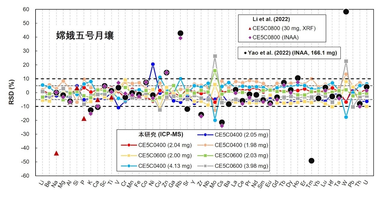嫦娥五号两批月壤48种主量和微量元素七次ICP-MS分析结果的相对标准偏差(RSD)。结果表明嫦娥五号月壤化学成分在毫克水平上非常均一(除了Ni和低含量的Mo和W)。图中对比了以前研究中X射线荧光光谱(XRF)和中子活化(INAA)方法获得的不同批次月壤成分。