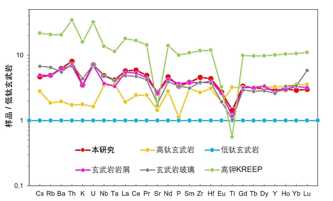 嫦娥五号月壤和其中玄武岩玻璃及岩屑亲石元素的低钛玄武岩标准化图解。嫦娥五号玄武岩这些元素特征不能仅用低程度部分熔融和高程度结晶分异进行解释,而反映出嫦娥五号玄武岩源区具有KREEP物质的贡献。