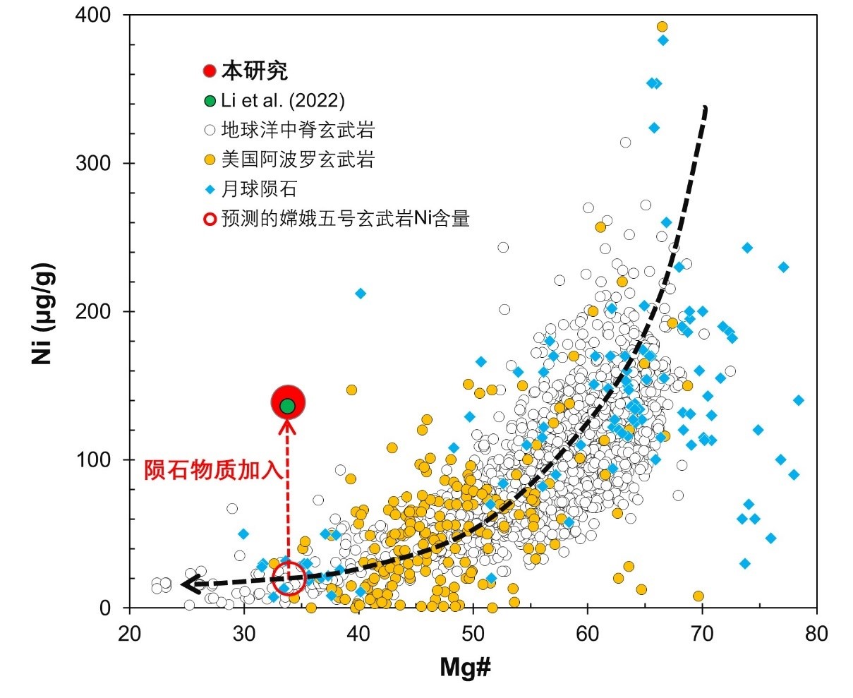 嫦娥五号月壤Ni和Mg#的组成,及其与美国阿波罗玄武岩、月球陨石和地球洋中脊玄武岩的对比。结果表明嫦娥五号月壤过剩(~110-120 µg/g)的Ni指示了约1%陨石物质的加入。