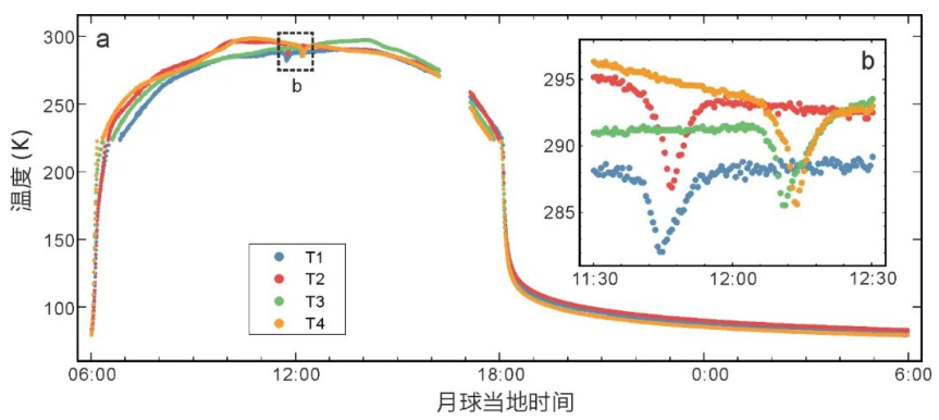 测量结果显示,在白天,月壤的温度主要受太阳辐射和周围环境热辐射的影响。日出后月壤温度快速上升,正午附近时温度达到最大值。正午之后温度开始下降,在傍晚附近温度急剧下降。夜间月表温度的变化主要受月壤的热物理性质影响,温度缓慢下降(下图a)。值得注意的是,在月球当地时间正午附近时,四个温度计的测量温度突然降低,而后急剧上升(下图b),这些温度变化与着陆器的阴影运动相关。