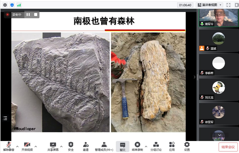 地球诞生之初就存在的南极大陆是地球多圈层相互作用研究的天然实验室,也是不同学科(包括地球科学、海洋科学及大气或环境科学等)交叉融合的契合点。裴军令研究员首先用一些精美绝伦的实地影像带领听众穿越时空,让师生们与极少触碰的美丽南极建立起了感性联系,之后详细介绍了南极科考情况及其研究团队的研究工作进展,对南极的基本地理、地质演化过程、各类矿藏探寻、动植物化石埋藏及南极大冰盖的形成等进行了详细剖析。认为南极的海陆变迁可能对全球环境-气候有重要影响,进一步的研究需要不同学科的交叉融合,裴军令研究员呼吁更多不同研究方向的专家学者积极参与南极研究,同时也分享了相关经验和参与途径。