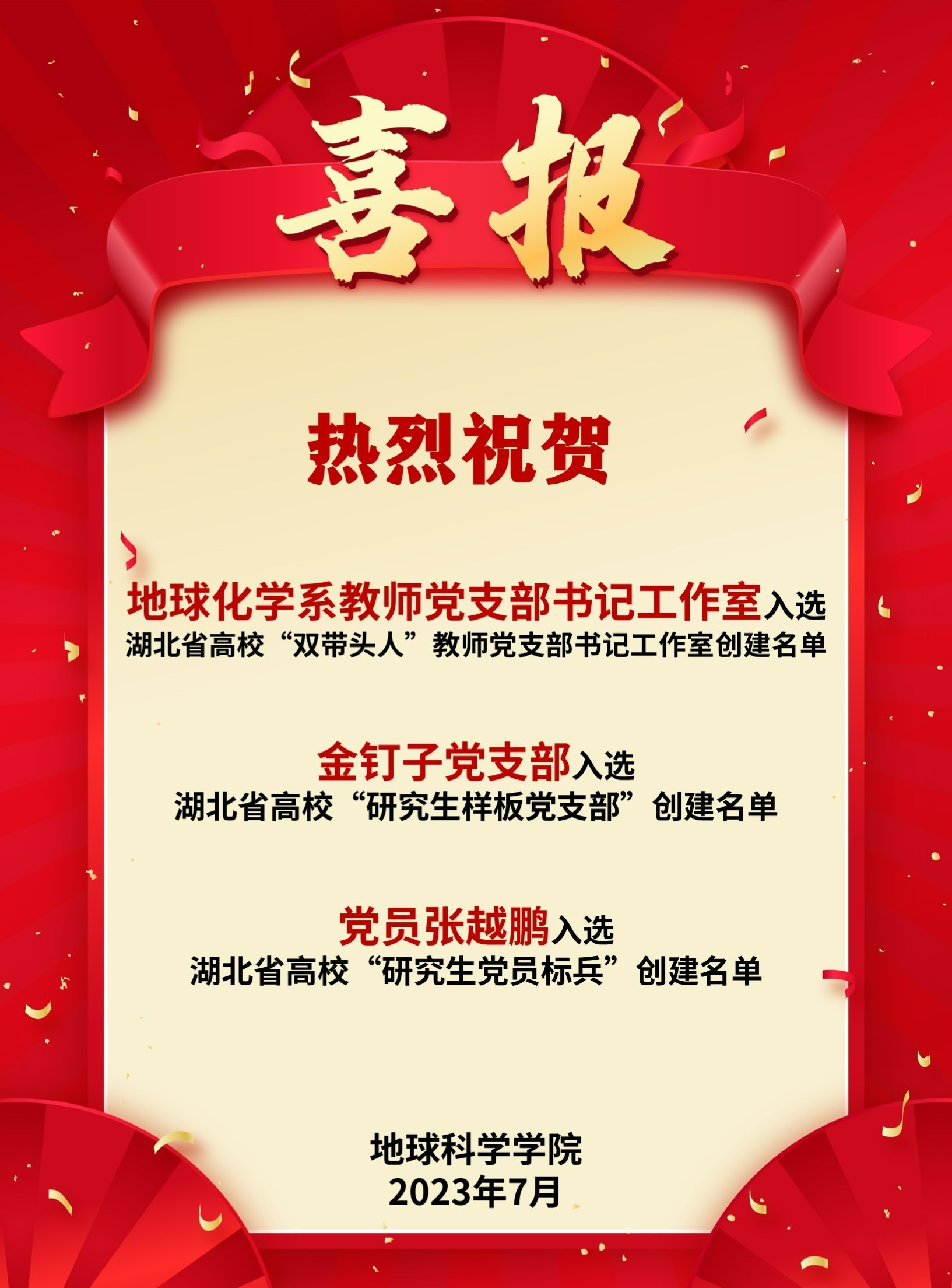 近日,湖北省高校“双带头人”教师党支部书记工作室、“研究生样板党支部”和“研究生党员标兵”创建结果揭晓,天下布魔 地球化学系教师党支部书记工作室入选湖北省高校“双带头人”教师党支部书记工作室创建名单,金钉子党支部(生物与环境演化研究生党支部)入选湖北省高校“研究生样板党支部”创建名单,党员张越鹏入选湖北省高校“研究生党员标兵”创建名单。