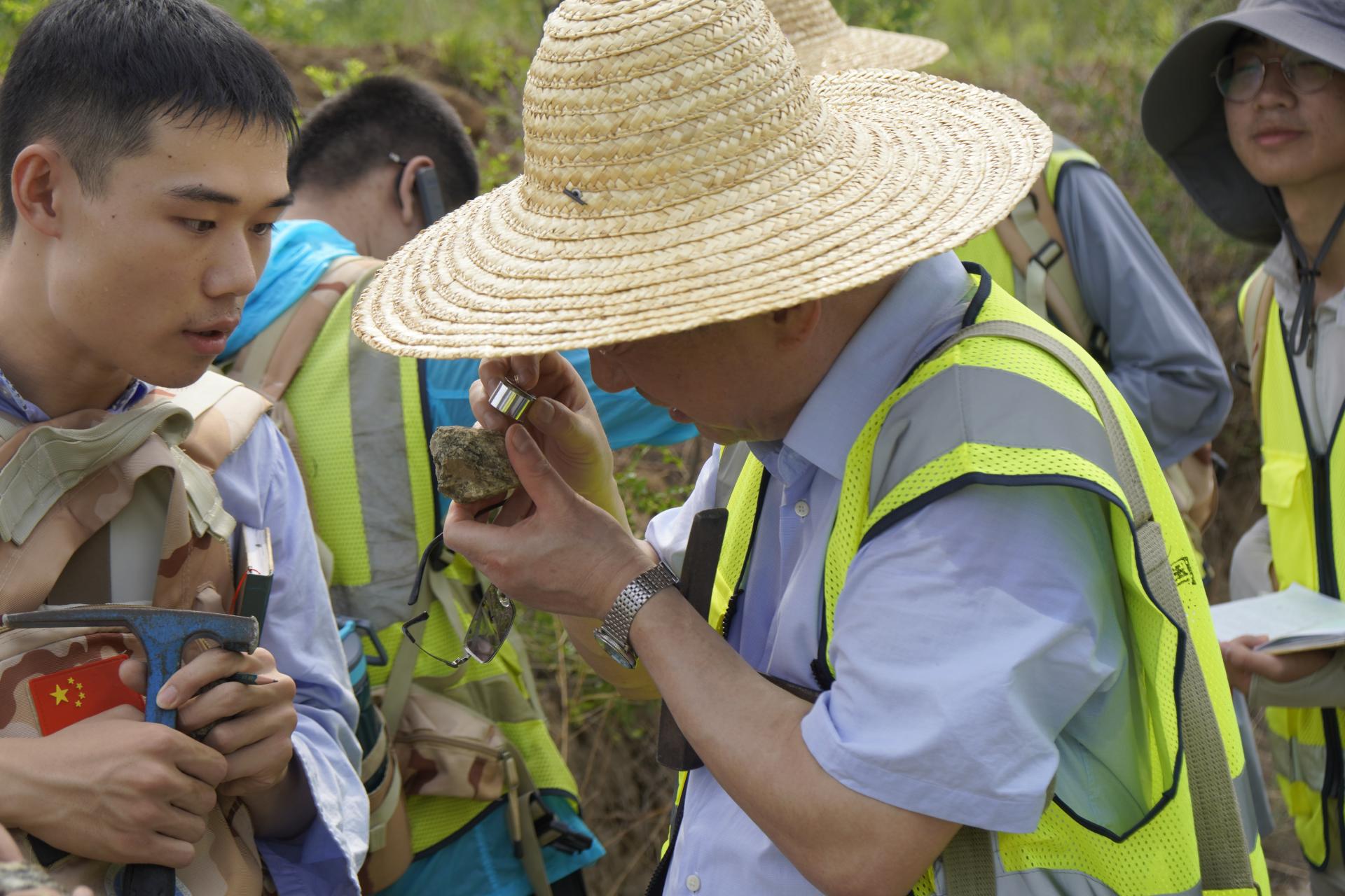 期间,王焰新一行随队参与野外实习。实习过程中,他与同学们一起听取老师授课,查看同学们的野外记录簿,并为同学们现场讲解坡积物与洪积物的野外地质现象。