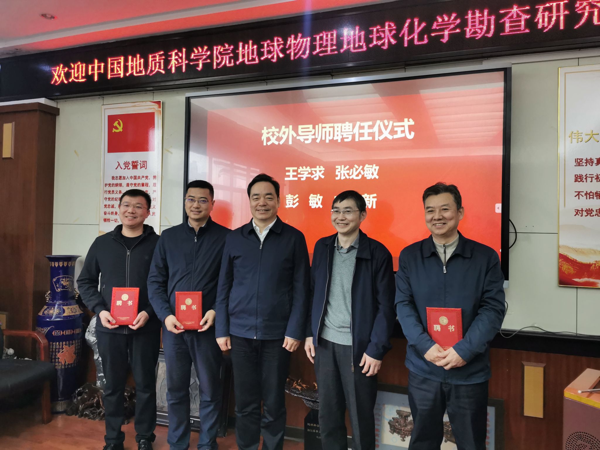 座谈会最后举行了校外导师聘任仪式,周刚书记为王学求、张必敏、彭敏和成杭新颁发了校外导师聘书。