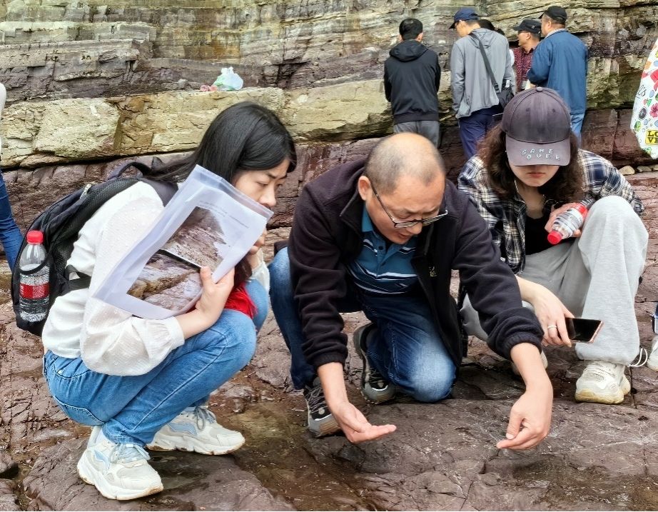 次日,在红岩长廊海蚀平台,大家见证了中国沿海第一崖滩长廊的壮美景色。海蚀作用在此处形成了海蚀崖、海蚀平台、海蚀柱等多种地质遗迹,展现了外动力地质营力和海洋演化的奇妙魅力。红岩长廊海蚀平台,强化了大家对现代海洋地质作用的认识,更加深入理解了“将今论古”的地质学原理。