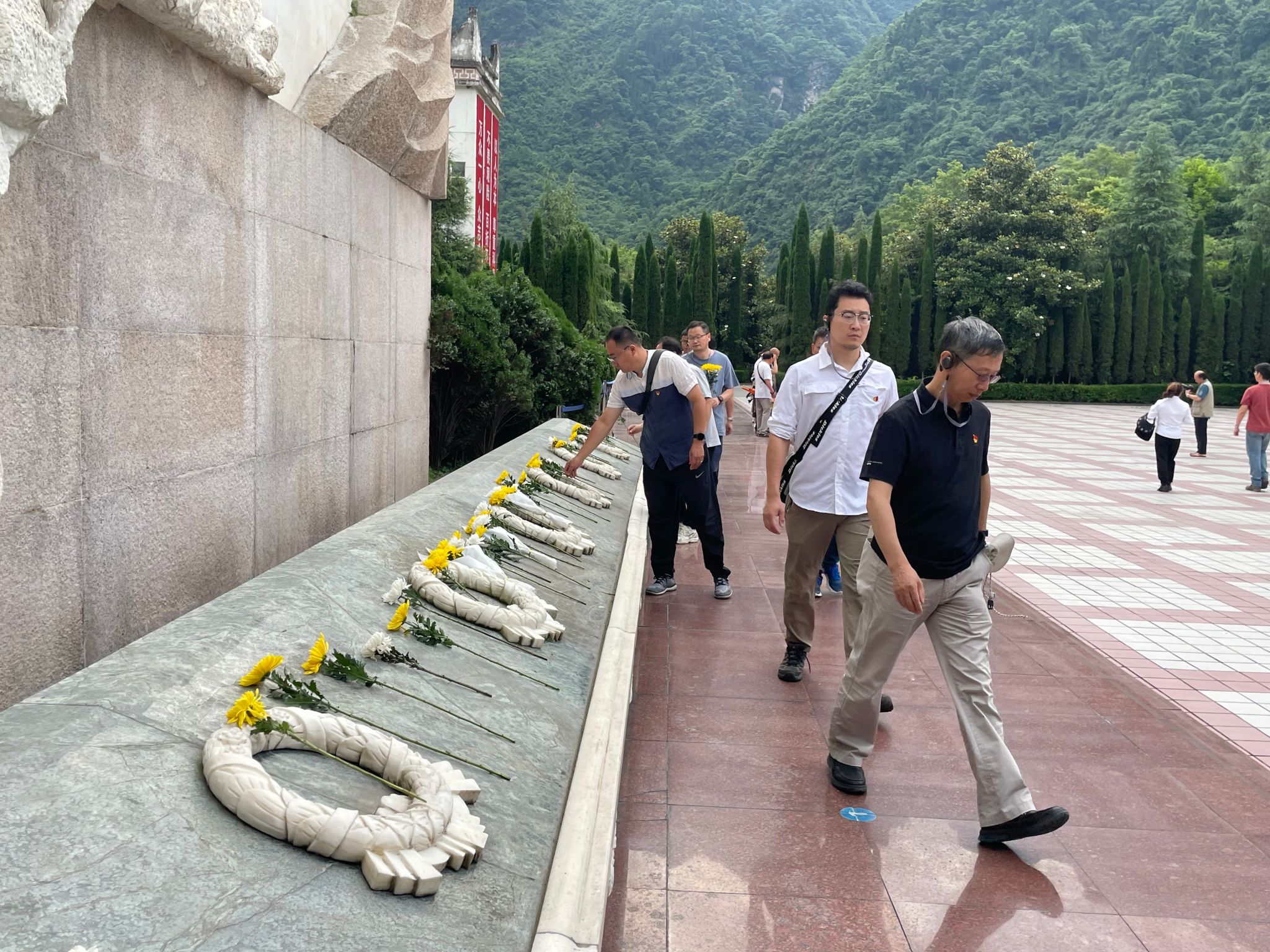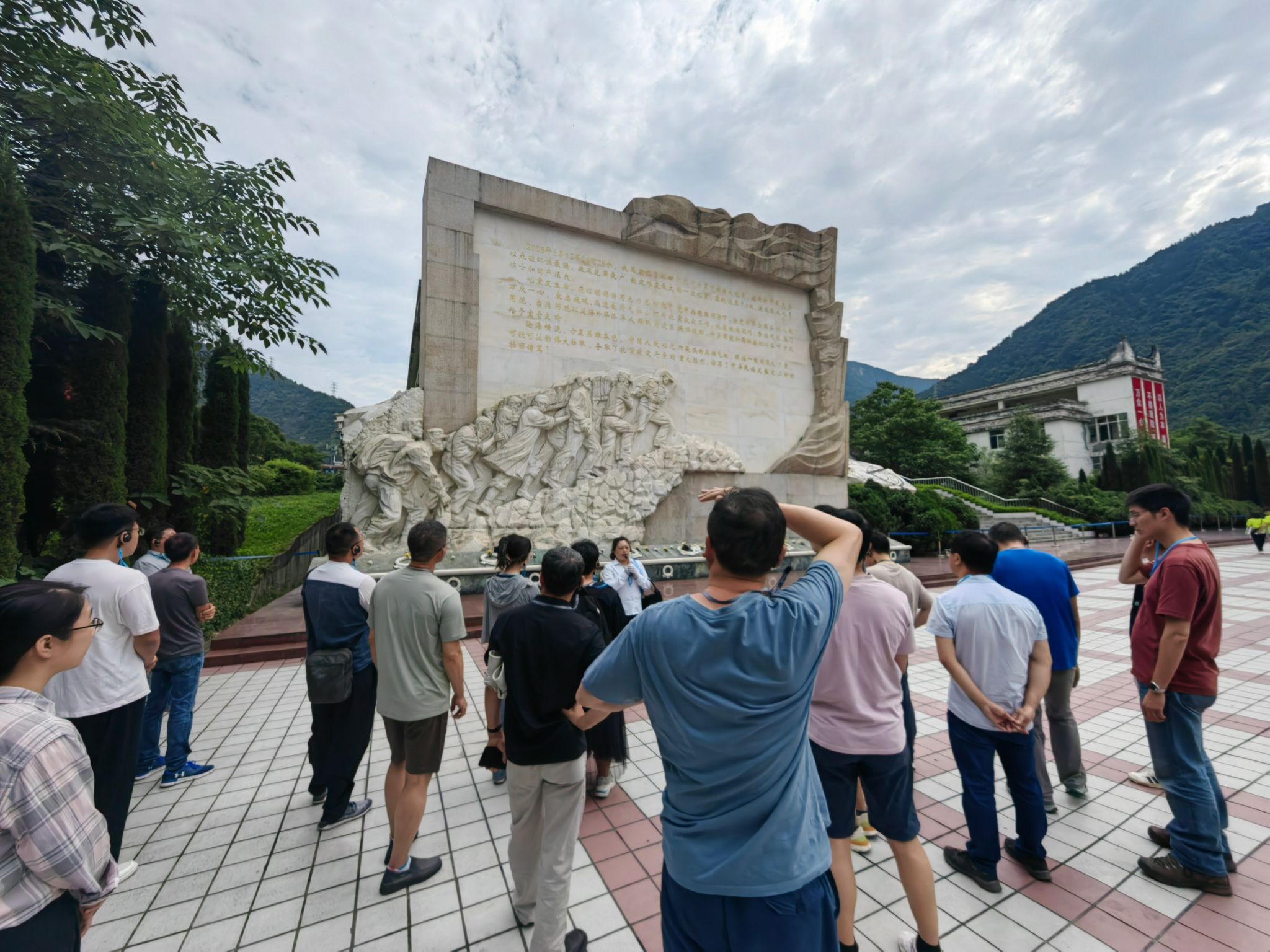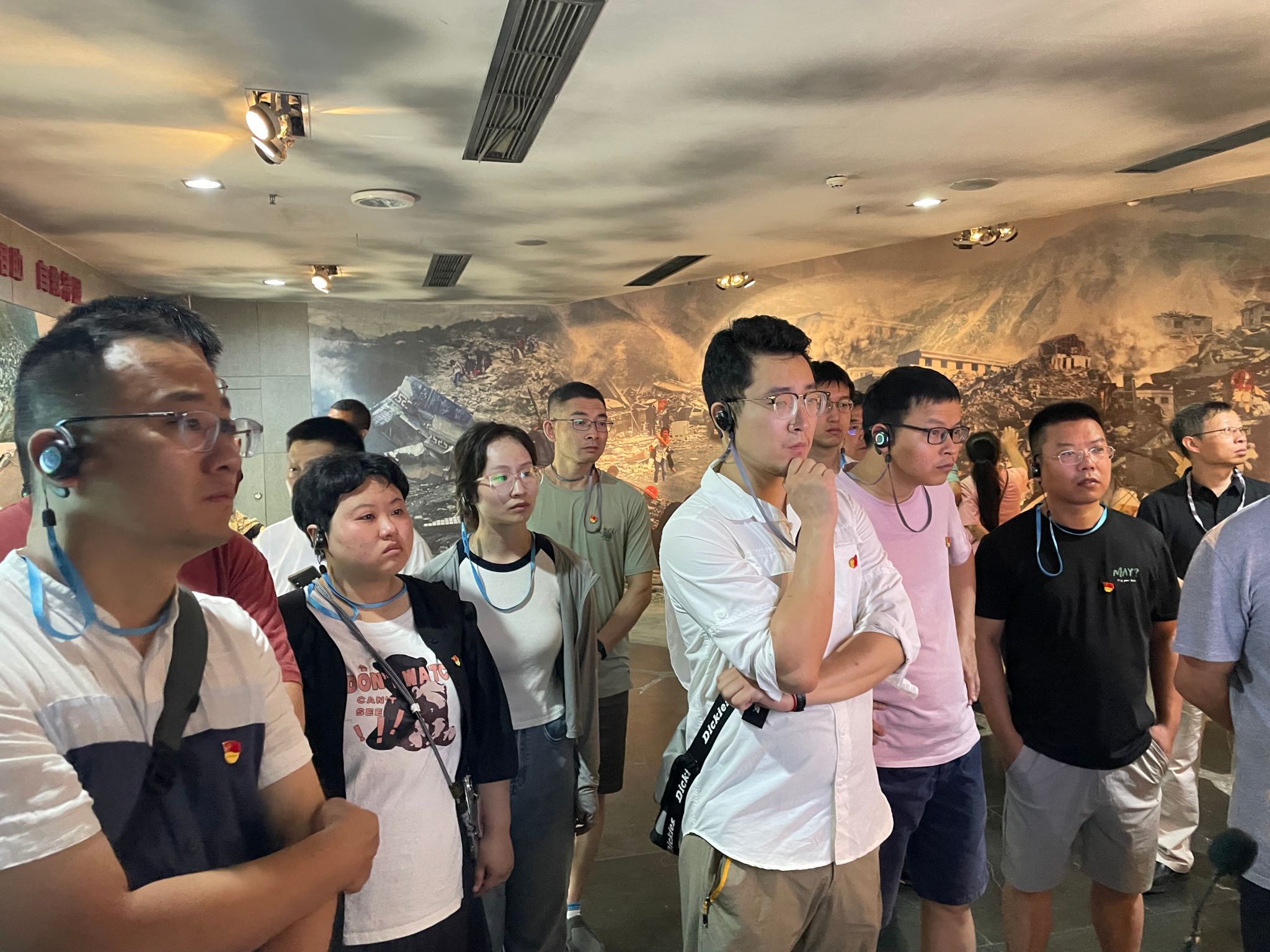 之后,大家登上512级台阶,来到震中纪念馆参观。震中纪念馆前是数千名遇难同胞和抗灾英雄的公墓,馆内展示了被地震摧毁的生活场景、卫星记录的地震实景和抗震救灾的一系列照片、鸡毛信和场景。讲解员也用自己和家人的亲身经历,让大家沉浸式地感受到地震的残酷和灾后党带领人民众志成城参与救援的震撼场景。