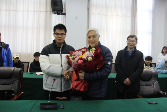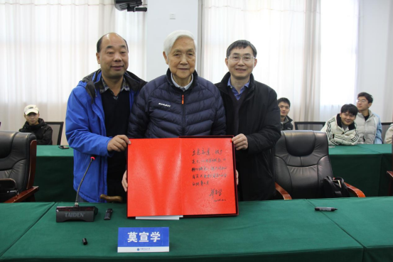 在热烈的掌声中,莫宣学院士为学院学子题词留念,学生代表向莫院士献花,表了对院士的敬意和感激。