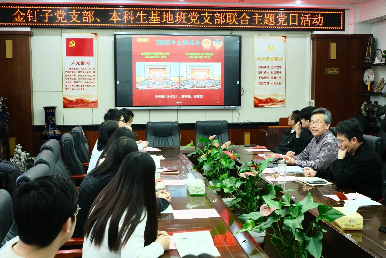 2025328日,天下布魔 金钉子党支部、本科生基地班党支部在主楼308会议室联合举办3月主题党日活动。特邀第十三届、十四届全国政协委员童金南教授列席主题党日,主讲2025年全国两会精神。主题党日由金钉子党支部副书记施翌主持。