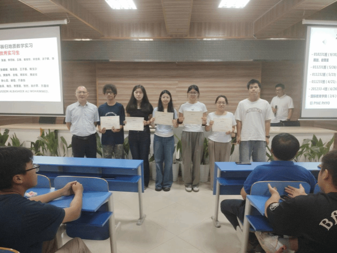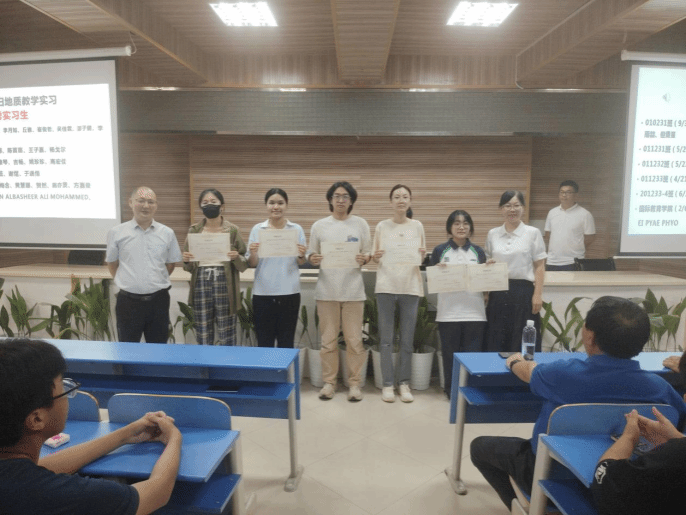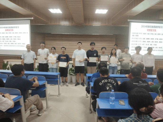 在表彰环节,大会对三个学院各班级的优秀实习生及三位优秀实习教师进行了表彰,以嘉奖他们在实习中的突出表现与责任担当。尤为值得关注的是,现场特别向颜佳新老师颁发秭归 “终身成就奖”,致敬其在地质实践教学领域的长期坚守与卓越贡献。
