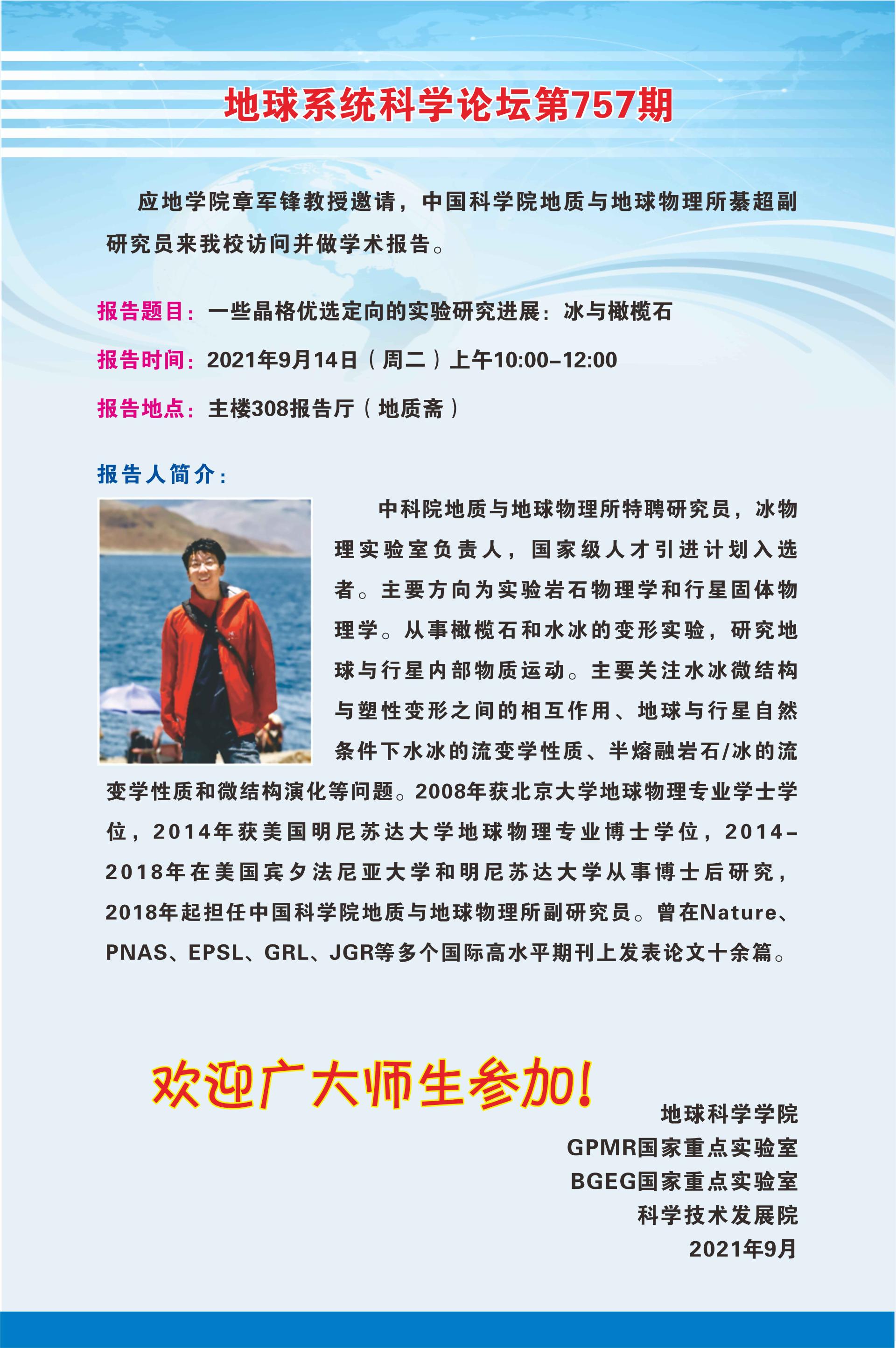 【9月14日】中国科学院地质与地球物理所綦超副研究员学术报告