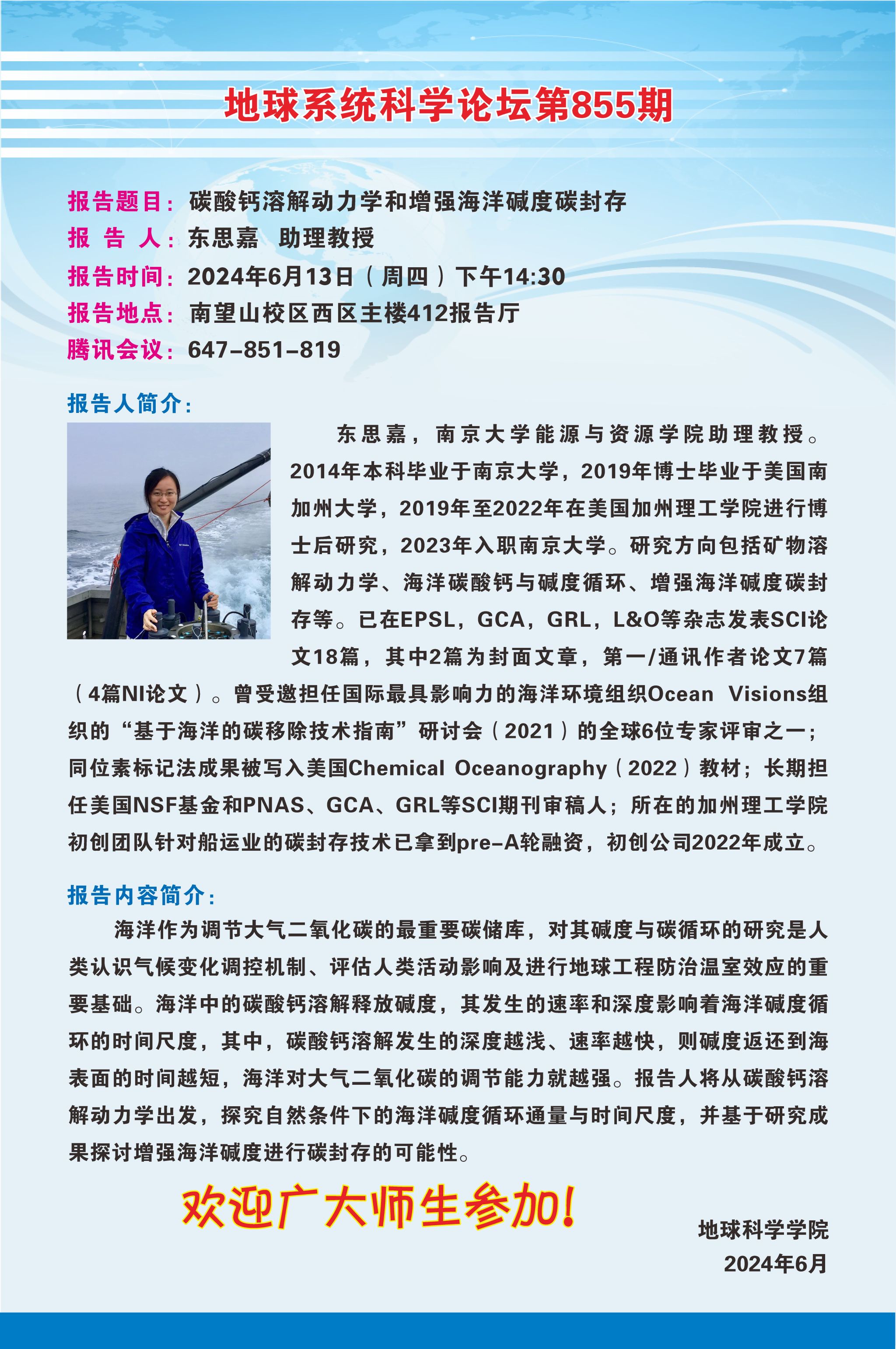 【6月13日】地球系统科学论坛第855期-东思嘉助理教授
