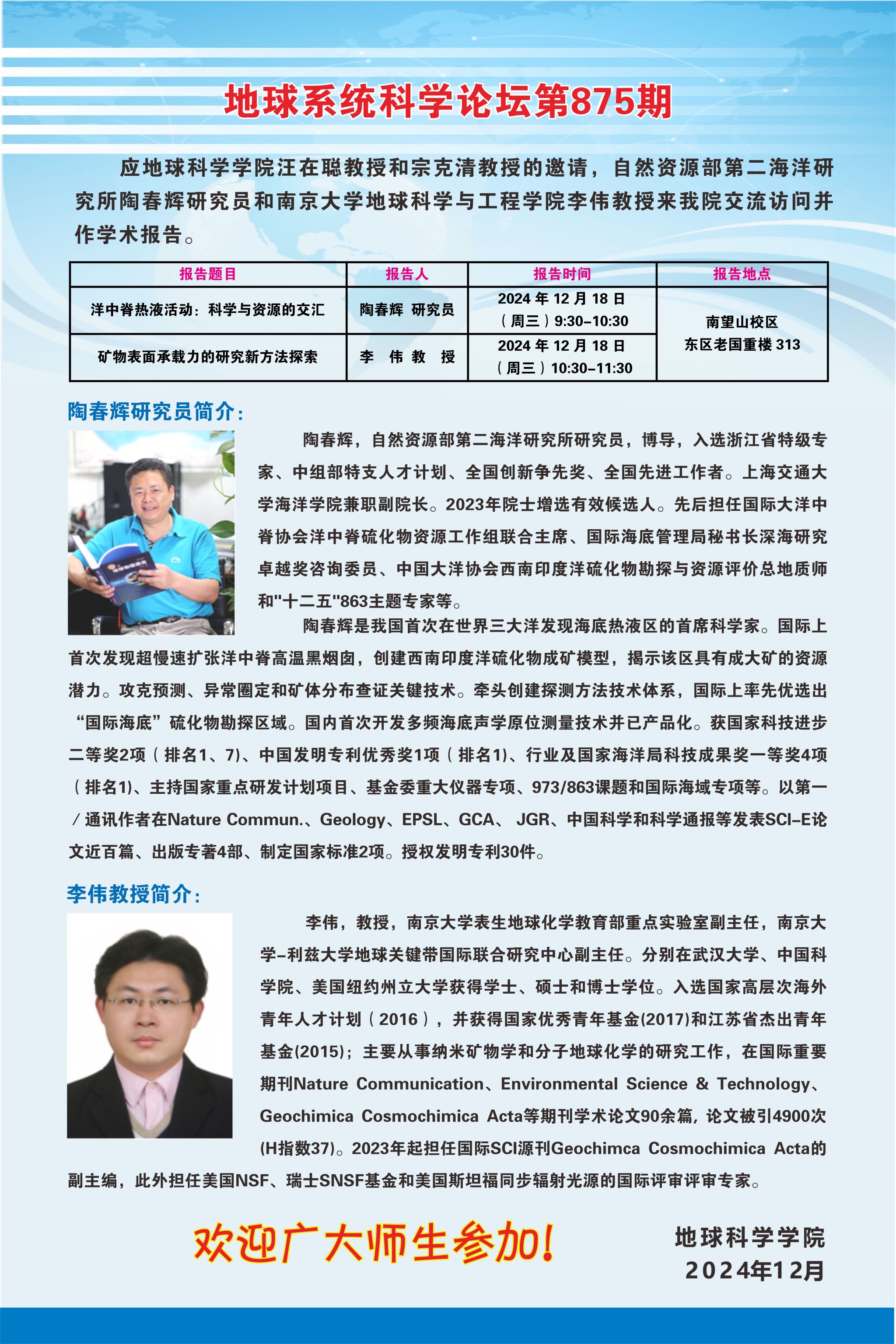 【12月18日】地球系统科学论坛第875期-陶春辉研究员、李伟教授