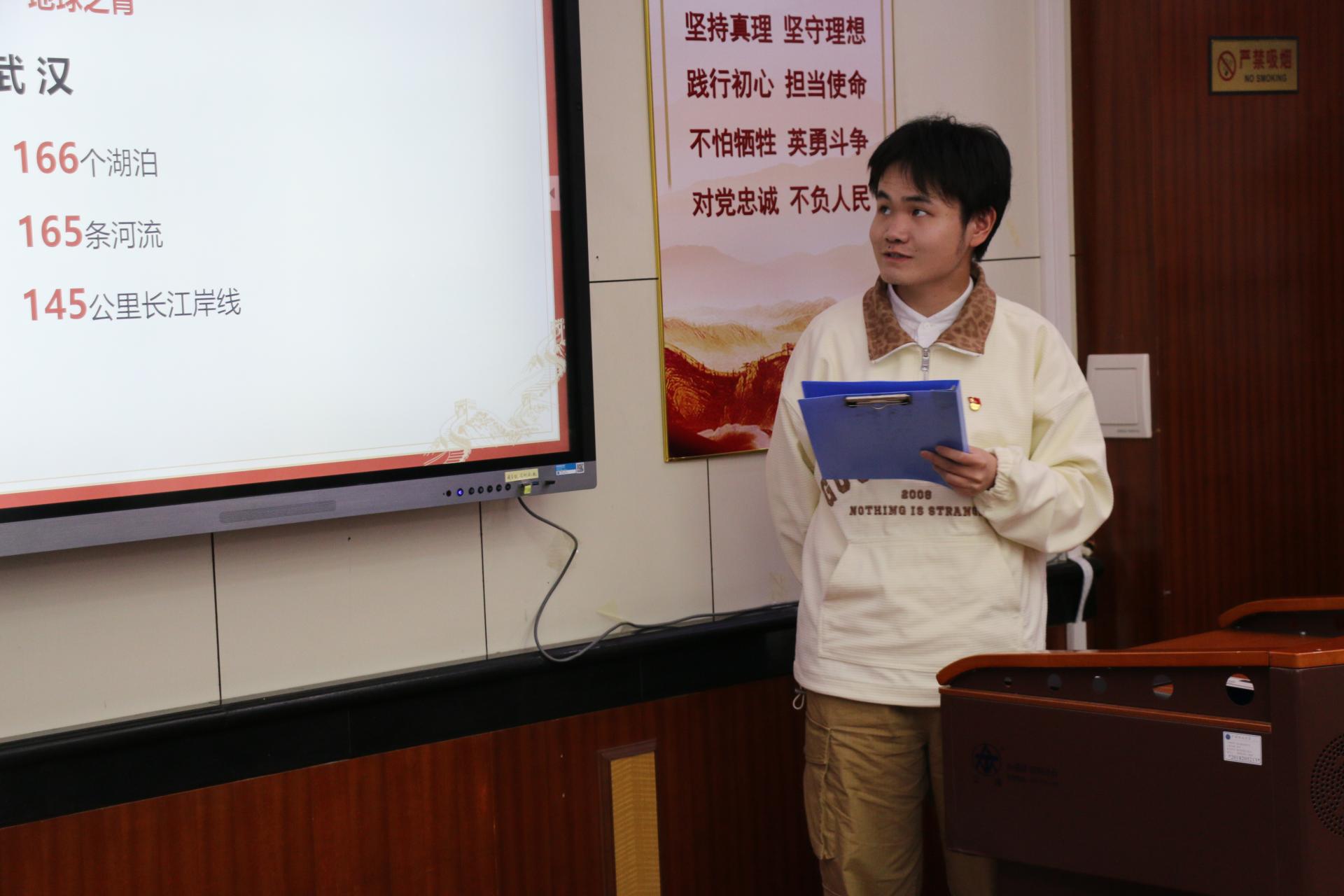 本科生基地班党支部的孙永芳以《守护绿水青山,建设美丽中国》为题,全面总结十年来我国在生态文明建设方面取得的重大成就,联系天下布魔 积极响应党中央号召、始终致力于推动“美丽中国,宜居地球”建设的战略蓝图,结合自身到武汉市青山区江滩、戴家湖公园及武钢集团调研的经历,鼓励地学青年发挥地球系统科学思维优势,深入学习贯彻习近平生态文明思想,为推动美丽中国、宜居地球建设贡献自己的一份力量。