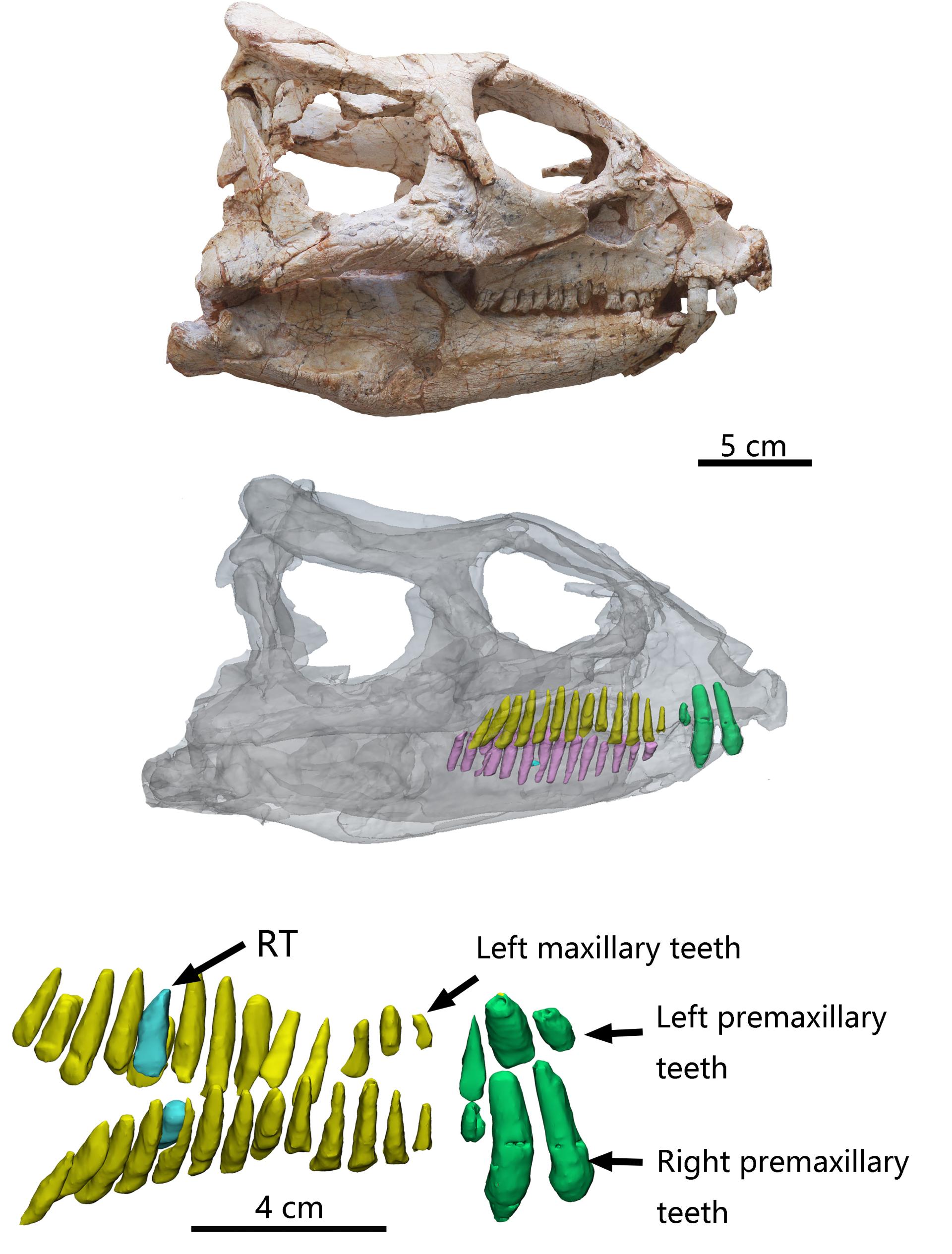 Figure 2. Photograph (top) and transparent reconstruction (middle) of Yinlong downsi skull. 3D models of premaxillary and maxillary dentitions (bottom). Yellow denotes maxillary teeth. Green denotes premaxillary teeth. Cyan denotes replacement teeth.