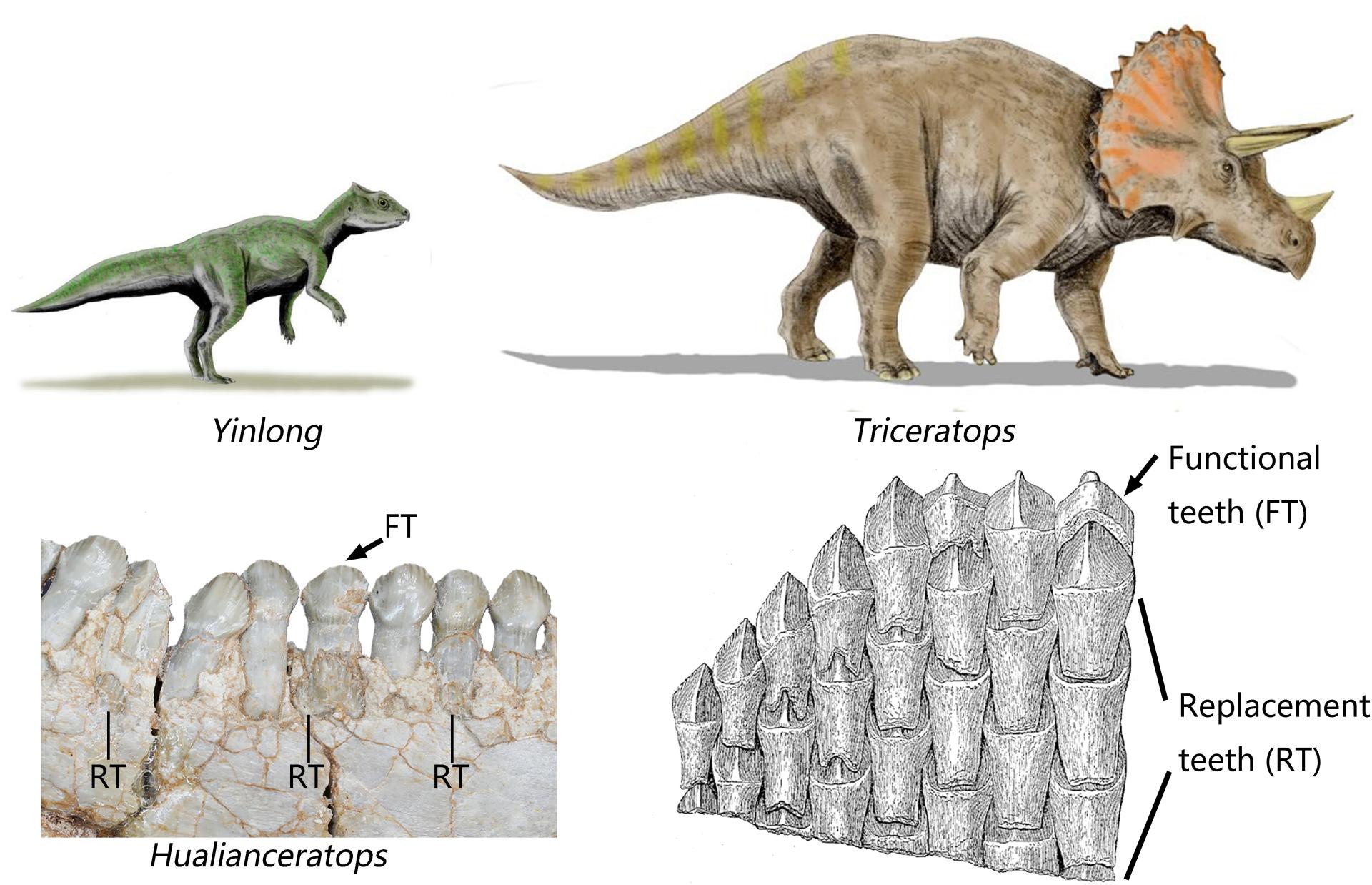 The researchers also study the other two early-diverging ceratopsians. The result displays that Chaoyangsaurus bears about 42 functional teeth but with 14 replacement teeth, which implies a higher tooth replacement ratio than Yinlong (Figure. 3). Another early-diverging ceratopsian, Hualianceratops wucaiwanensis from the same region of Yinlong, bears 5 replacement teeth and 10 functional teeth in an incomplete mandible. It represents the early-diverging ceratopsian with the highest tooth replacement ratio. The tooth replacement ratio of these early-diverging ceratopsians is far slower than that of Triceratops.